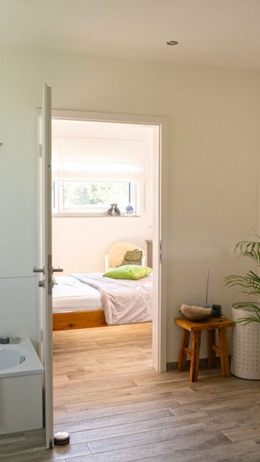 Im 90° Winkel zur Doppelgarage liegt das Wohnhaus, der Eingang liegt direkt am Hofplatz. Die charakteristischen Merkmale dieses Hauses ist zum einen das Satteldach auf einem Bungalow. Die Decke geht im Essbereich frei bis zum First und macht ein tolles Raumgefühl.