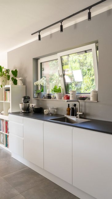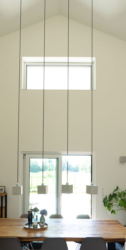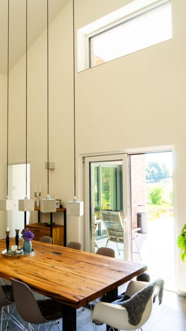 Im mittleren Bereich des Hauses öffnet sich das Esszimmer zur Küche und dem Wohnzimmer. Dadurch entsteht ein offener Bereich mit mehreren Sichtachsen durch die Rübe und immer auch in den Garten.