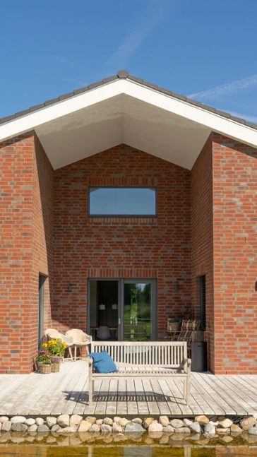 Im Garten bildet ein schön bepflanzter Teich das Kernstück, mittig vor dem Haus liegend. Vom Freisitz aus geht der Blick immer über den etwas tiefer liegenden Gartenteich.