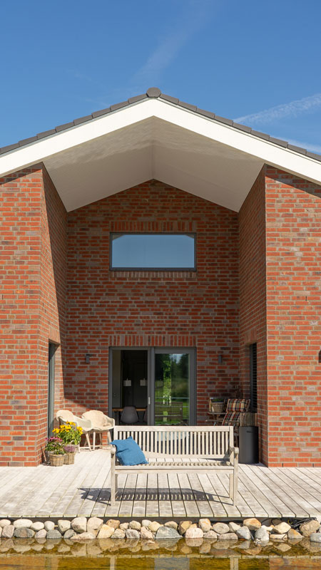 Auf der dem Garten zugewandten Hausrückseite ist ein Freisitz in das Haus eingelassen. Damit ist ein wettergeschützter Platz zum sonnenbaden, lesen oder plaudern entstanden. Das Wohnzimmer und eins der Schlafzimmer liegen sich hier gegenüber.