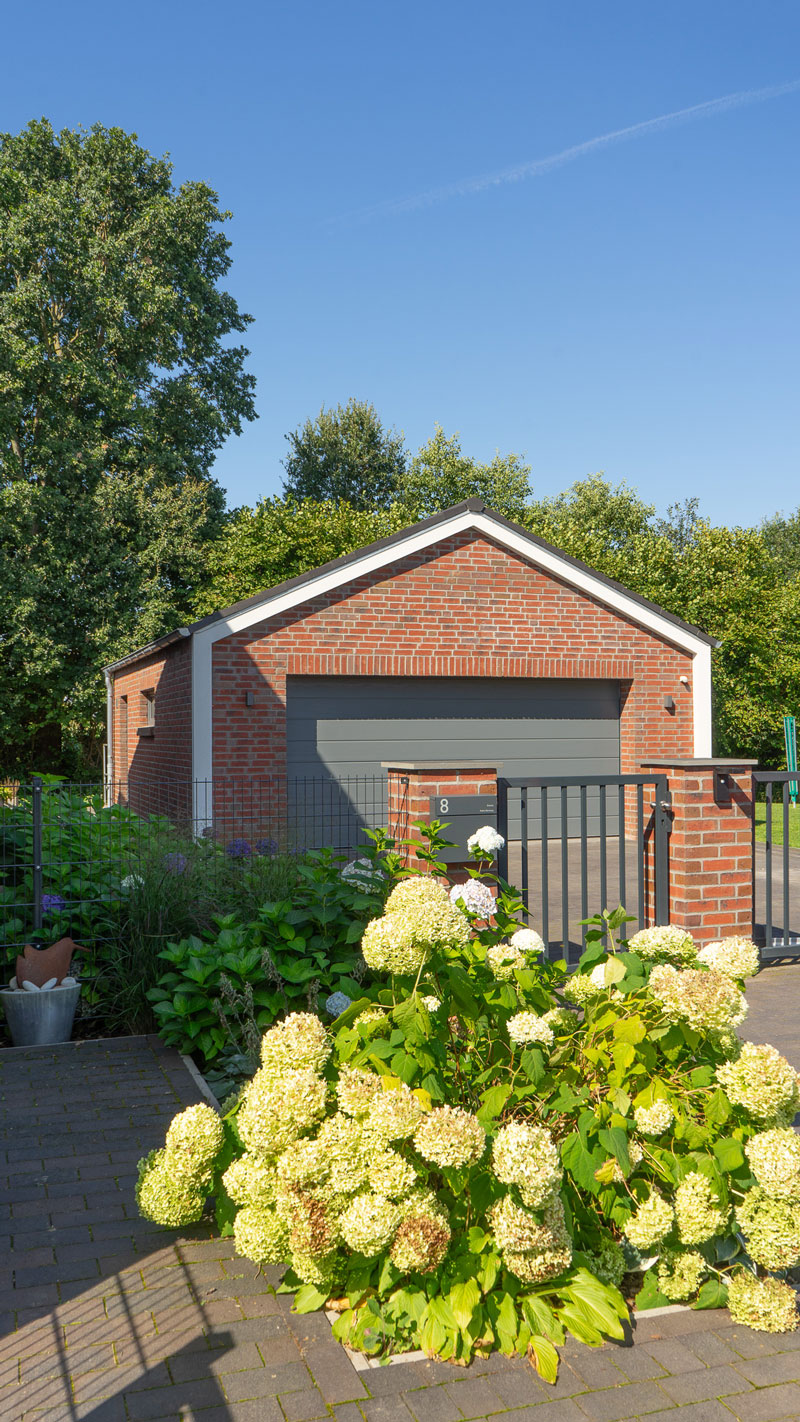 Das erste das dem Besucher beim betreten des Grundstücks auffällt, ist die die gerade zur Auffahrt verlaufende freistehende Doppelgarage, die im identischen Design wie das Wohnhaus gestaltet ist.