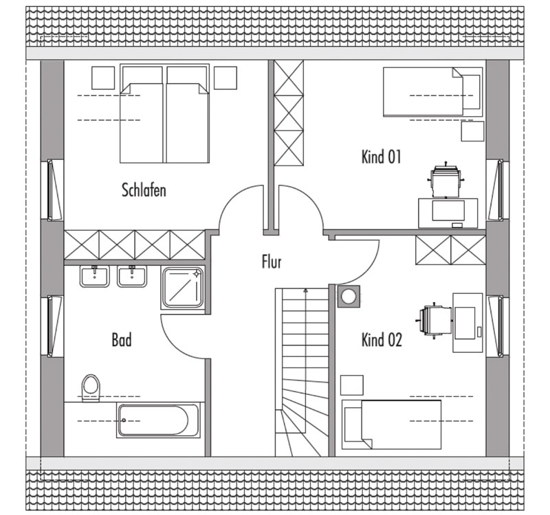 Die Gliederung des offenen Wohnbereichs erfolgt im Grundriss über Eck. Das Obergeschoss wird durch die Treppe direkt im Eingangsbereich erschlossen. Ein großer Flur im Obergeschoss sorgt für eine klare Gliederung der Räume. Über die Fenster in den Giebelseiten des Hauses gelangt genügend natürliches Licht in die Zimmer.