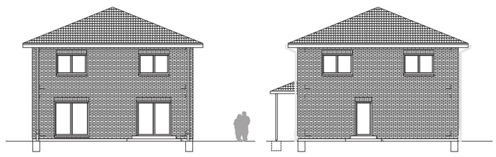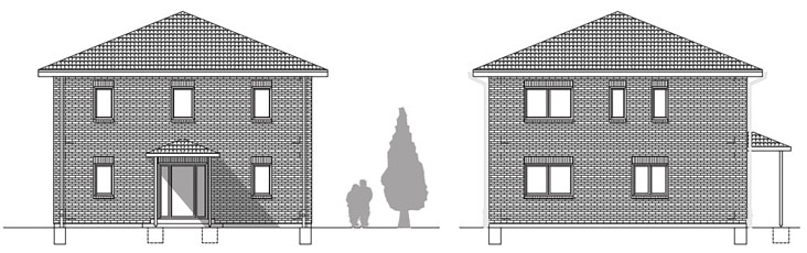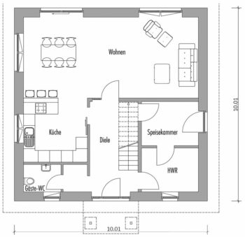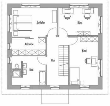 Die Haustürüberdachung betont klar die Vorderseite des Hauses. Die große Diele gliedert das Erdgeschoss und eine Nische bietet Platz für eine Garderobe. Über die geradläufige Treppe gelangt man ins Obergeschoss. Auch hier ist der Flur breit und hat seine eigene Tageslichtquelle.