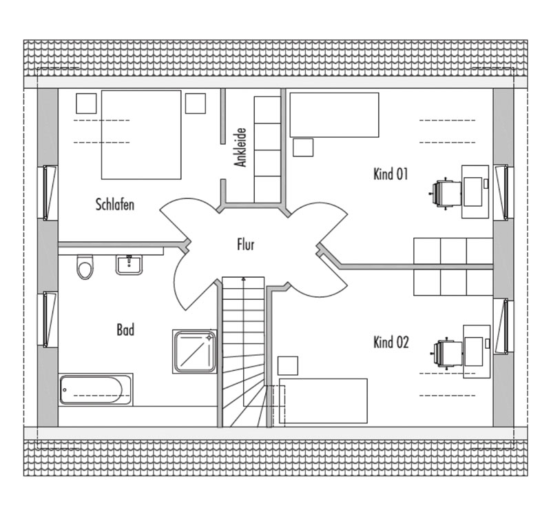 Im Erdgeschoss sorgt die offene Küche für einen sehr großen einladenden Wohnbereich. Dank der Raumaufteilung über Eck sind Couchecke und Küche trotzdem voneinander separiert. Die Essecke wirkt verbindend zwischen diesen beiden Bereichen. Im Obergeschoss befinden sich die Schlafräume und das Hauptbad. Durch die schräggestellten Wände wird der Flur so klein wie möglich gehalten und den weiteren Räumen der maximale Raum gegeben. Durch Dachflächenfenster kann für mehr natürliches Licht gesorgt werden.