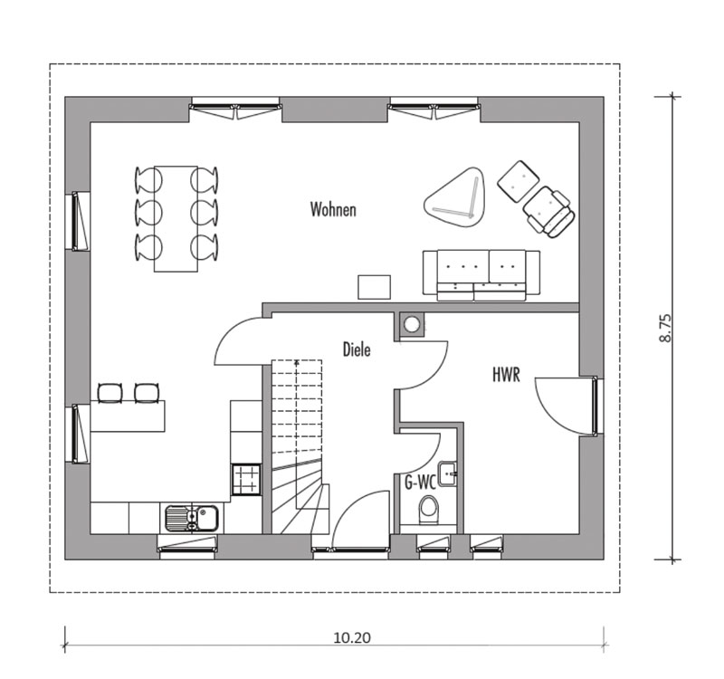 Die Küche im vorderen Bereich des Hauses ermöglicht während der Arbeit einen Blick auf den Eingangsbereich. Gleichzeitig ist der Hauswirtschaftsraum über den Flur schnell zu erreichen. Das Esszimmer und das Wohnzimmer teilen sich die hintere Seite des Hauses mit direktem Zugang zum Außenbereich. In zwei Zimmern im Dachgeschoss schafft die Gaube zusätzlichen Platz und bricht optisch außerdem die Ansicht der Dachfläche auf. Der sehr kleine Flur sorgt dafür, dass die Fläche im Obergeschoss optimal für Zimmer genutzt wird.
