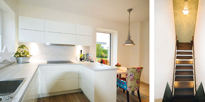 Der großzügige Wohnbereich öffnet sich zur Terrasse und zum Garten hin über drei große Glasflächen. Bei der Grundfläche ist das Gästezimmer obligatorisch. Das Bad ist im Kapitänsgiebel untergebracht und mit einer großen Glasfläche zum Garten ausgestattet. Das Schlafzimmer beherbergt außerdem ein Ankleidezimmer. Bodentiefe Fensterelemente sorgen für ausreichend Tageslicht.