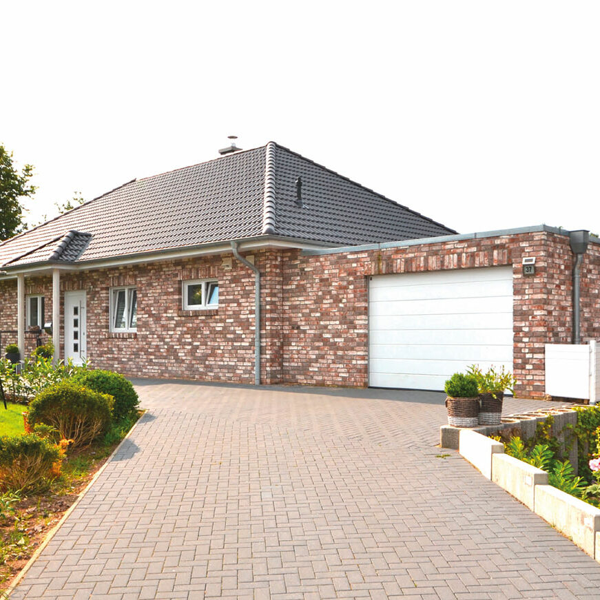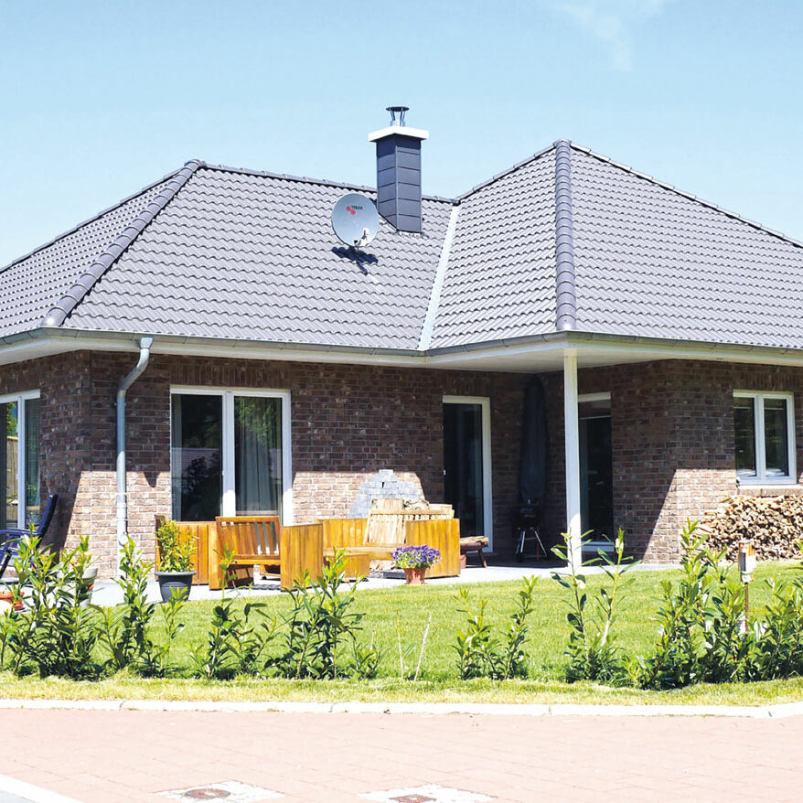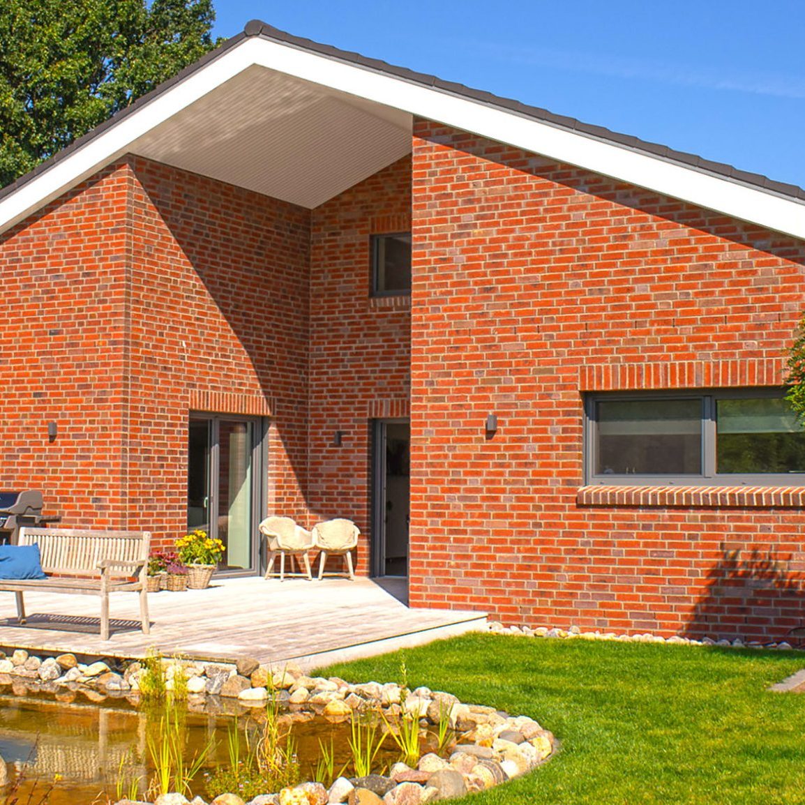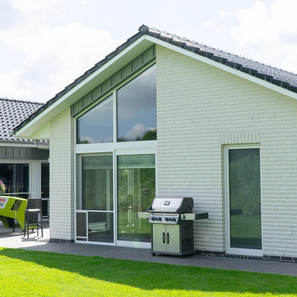 Der Grundriss trennt klar den gemeinschaftlichen Bereich von den Privaträumen. Durch die Fensterelemente im Wohnzimmer, die nur über eine Eckstütze getrennt sind, öffnet sich das Gebäude zum Außenbereich hin. Durch die Positionierung des Hauswirtschaftsraums direkt am Eingang kann auf eine Neben- eingangstür verzichtet werden. Bei der Konstruktion des Dachbodens kann eine Ausbaureserve berücksichtigt werden. Diese wird über eine Treppe aus dem Flur erschlossen.