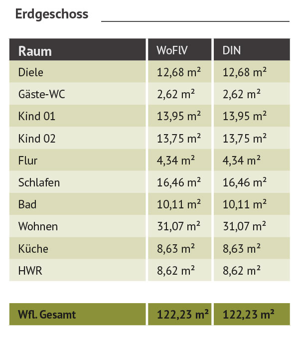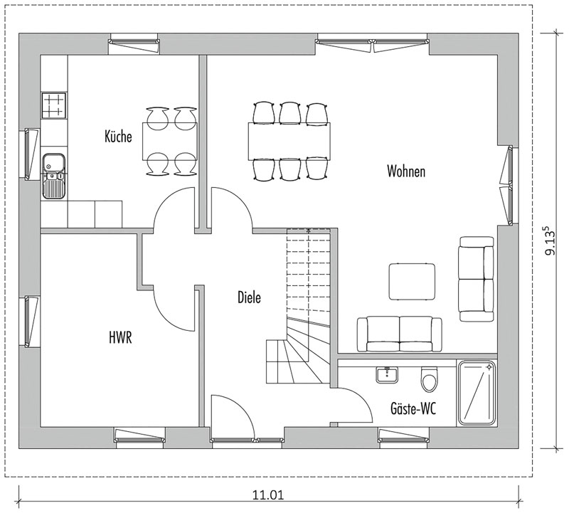 Der Grundriss trennt klar den gemeinschaftlichen Bereich von den Privaträumen. Durch die Fensterelemente im Wohnzimmer, die nur über eine Eckstütze getrennt sind, öffnet sich das Gebäude zum Außenbereich hin. Durch die Positionierung des Hauswirtschaftsraums direkt am Eingang kann auf eine Neben- eingangstür verzichtet werden. Bei der Konstruktion des Dachbodens kann eine Ausbaureserve berücksichtigt werden. Diese wird über eine Treppe aus dem Flur erschlossen.
