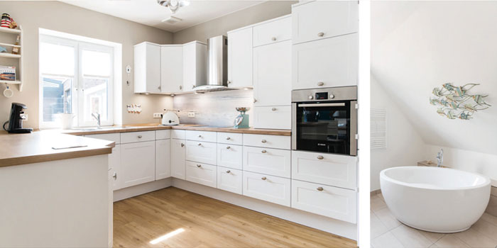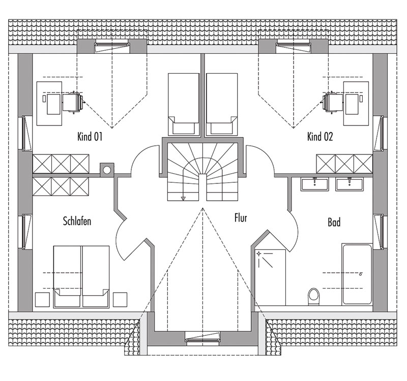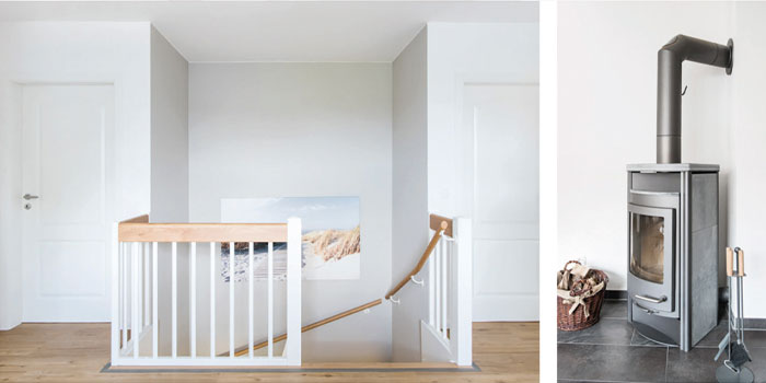 Die Spannung der Grundrisse liegt in der ähnlichen Raumaufteilung und dem Wunsch, den Friesengiebel auch im Inneren des Hauses in den stilistischen Mittelpunkt zu rücken. Unten bildet er den Eingangsbereich mit einem großzügigen Windfang und oben bildet sich ein weiteres Entrée dadurch, dass der Flurbereich bis zur Fassade offen bleibt. Hierdurch bildet sich beim Betreten des Obergeschosses eine Sichtachse nach draußen. Gleichzeitig ist genug Platz für einen Spieltisch, eine Leseecke oder einen kleinen Schreibtisch vorhanden. Die Gauben auf der anderen Hausseite bringen Licht in die Kinderzimmer.