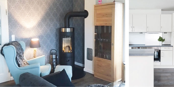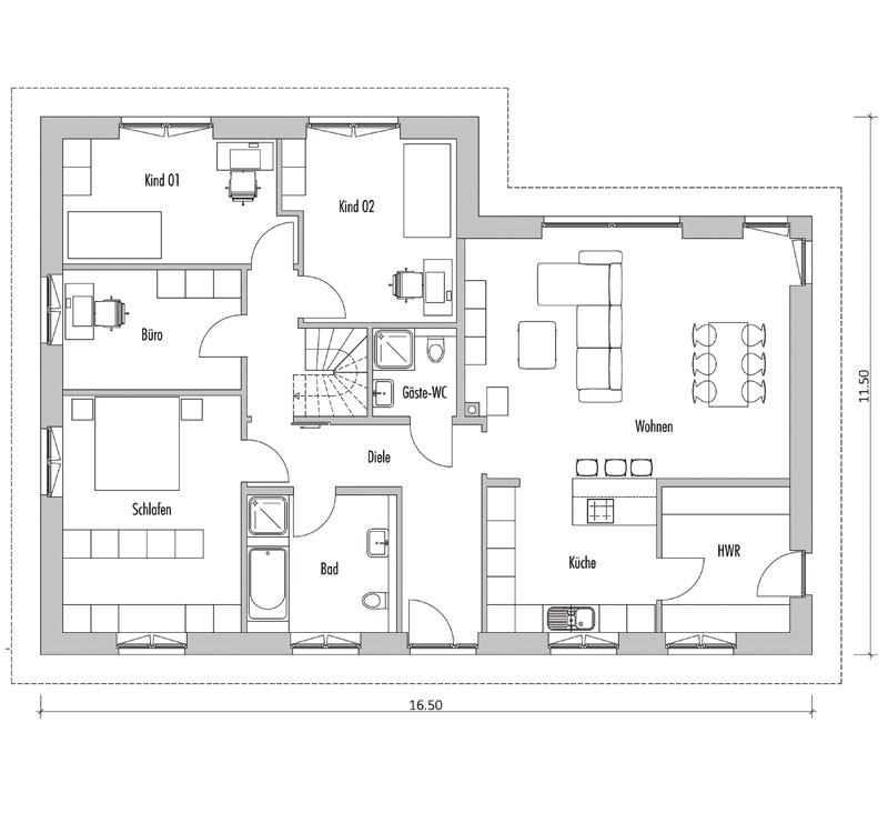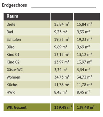Ein großes bodentiefes Fensterelement bildet die Verbindung zum Außenbereich. Durch die optimale Positionierung ist auch aus der Küche heraus der Blick in den Garten garantiert. Der Schlafbereich ist über den Flur getrennt vom Wohnbereich. Auch hier sind wiederum das Elternschlafzimmer und die Kinderzimmer voneinander getrennt, nicht zuletzt durch das Arbeitszimmer.