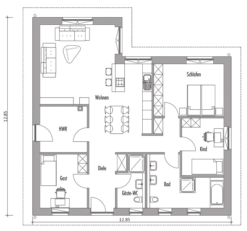 Das Besondere an diesem Entwurf ist die offene Diele mit der Sitzgruppe. Hiermit wird bewusst auf eine Abgrenzung zwischen Eingangsbereich und Wohnbereich verzichtet. Über den Winkel im Grundriss ist das Wohnzimmer optisch separiert.