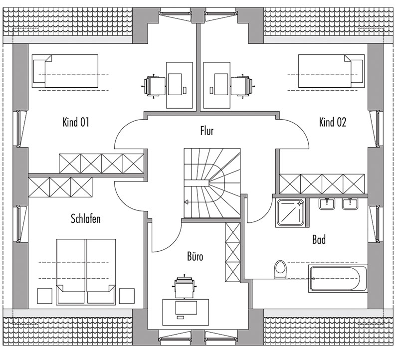 Im Obergeschoss befinden sich die Schlafräume und das Hauptbad. Der Flur ist groß genug, um sich auch hier außerhalb der Räume zu begegnen. Durch Dachflächenfester kann für mehr natürliches Licht gesorgt werden.