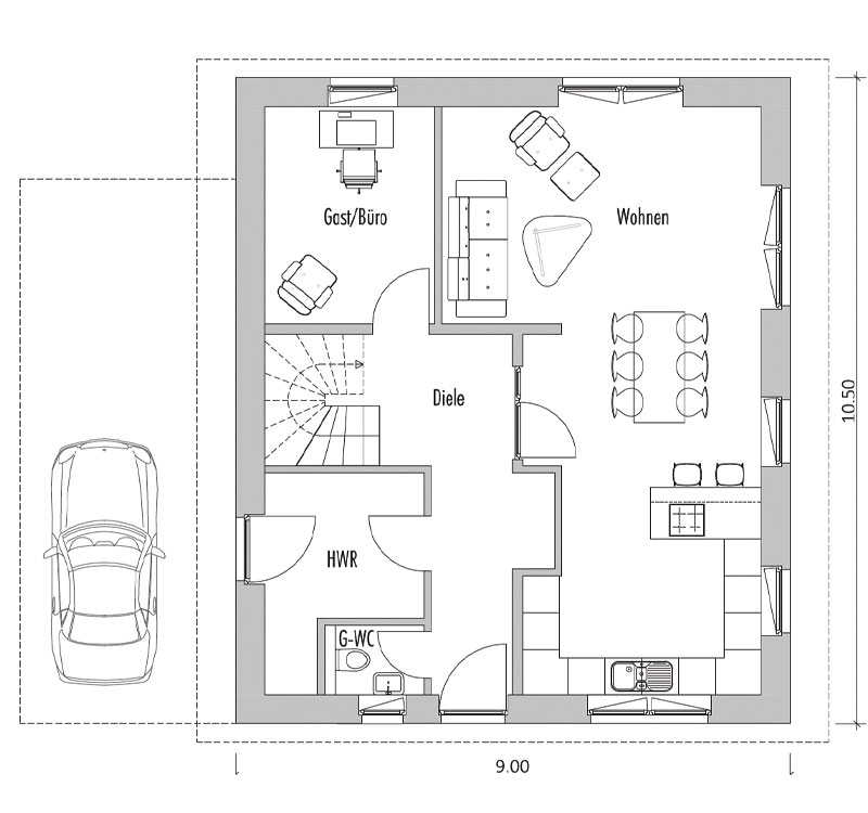 In der Mittelachse sind der Wohnbereich und über die Treppe der Schlafbereich miteinander verbunden. Durch ein großes transparentes Türelement wird diese Achse unterstützt. Die Wandnische im Flur sorgt für die nötige Ordnung im Eingangsbereich.