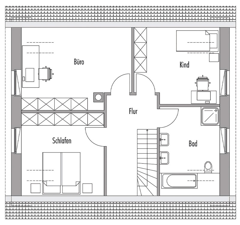 Die großzügige Küche bietet genug Platz für eine Sitzecke. Für Ihre Gäste kann außerdem eine Tafel im Wohnbereich stehen. Über ein großes Terrassentürelement hat man eine direkte Anbindung an die Terrasse. Die Diele bietet genügend Platz für eine Anrichte oder einen Schrank. Das Kinder- und Schlafzimmer sind in den gegenüberliegenden Ecken des Hauses angesiedelt. Das dazwischenliegende Bad ist gut zu erreichen.